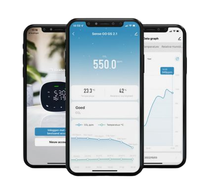 Met de bijbehorende Sense Go app is het mogelijk om het apparaat volledig in te kunnen stellen en koppelen met uw netwerk. In de app kunt u de huidige waardes in zien, maar ook bewaren. Dit wordt omgezet in een excel bestand met een druk op de knop.